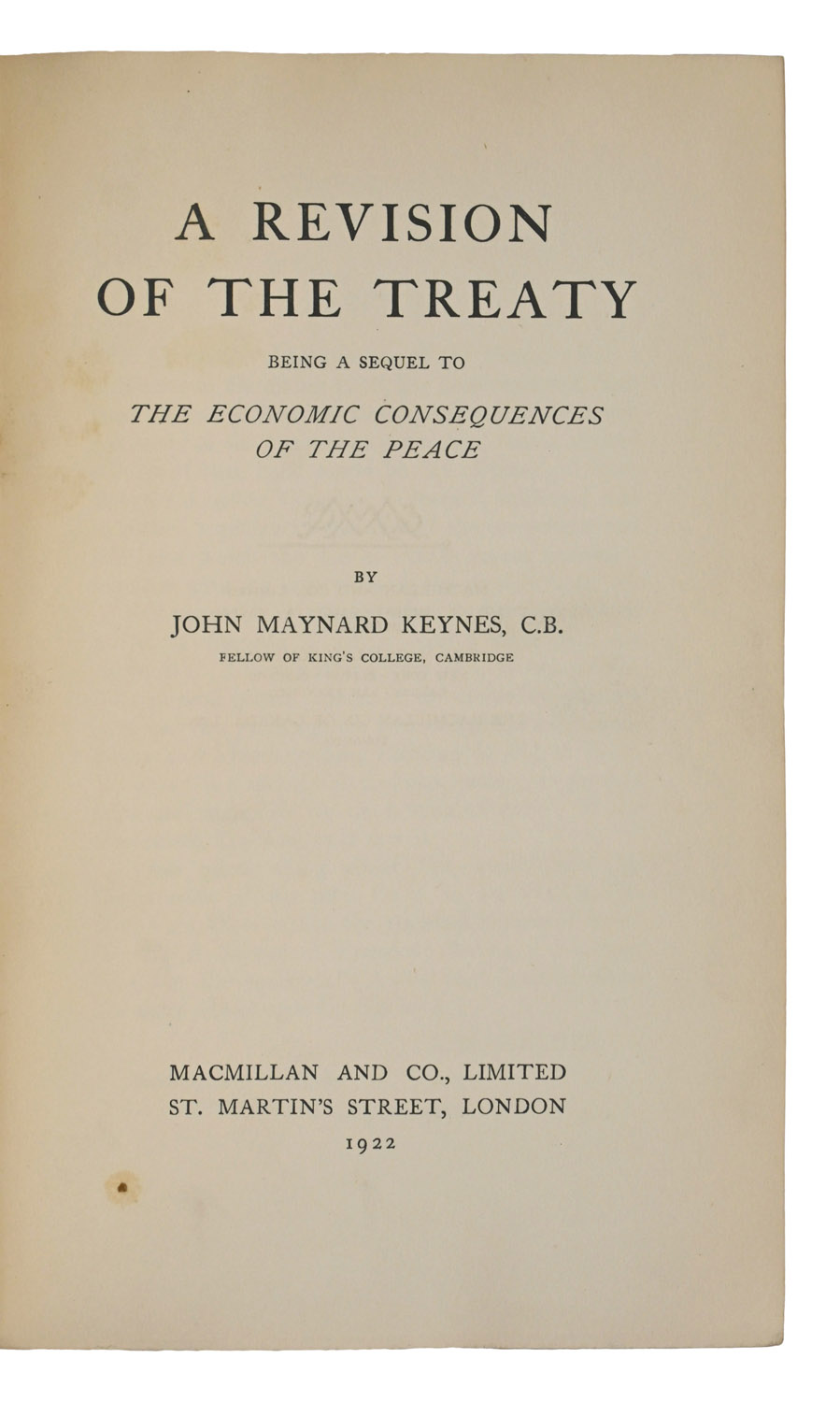 The first edition of Keynes' follow up to his 1919 publication of The Economic Consequences of the Peace.