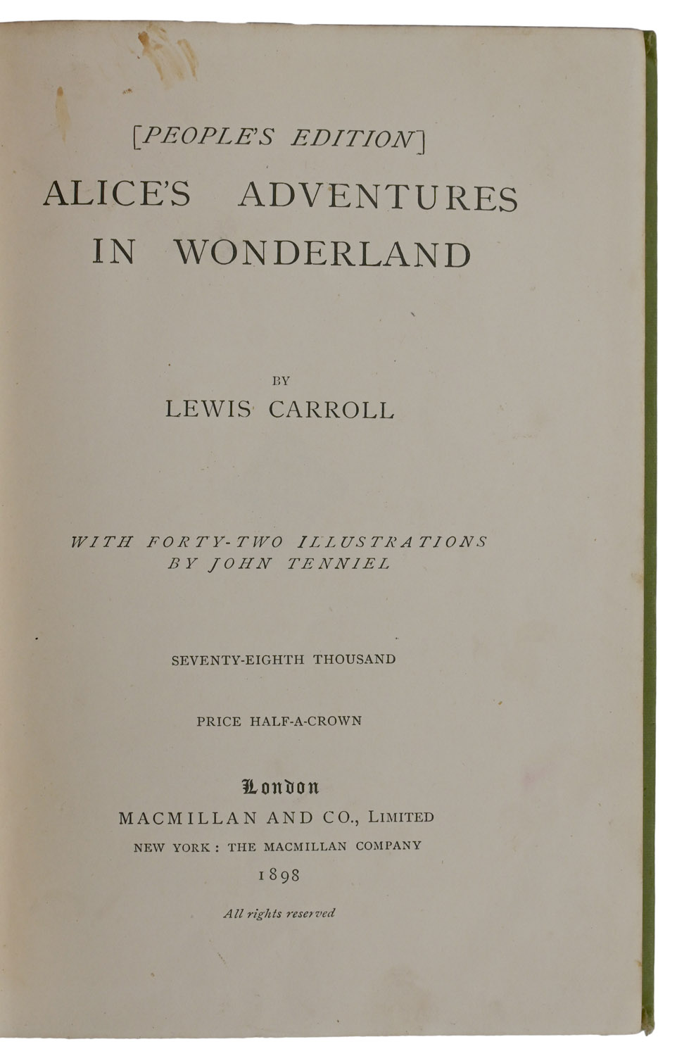 An early reprint of Macmillan's People's Edition of Alice, first published in this format in 1887.