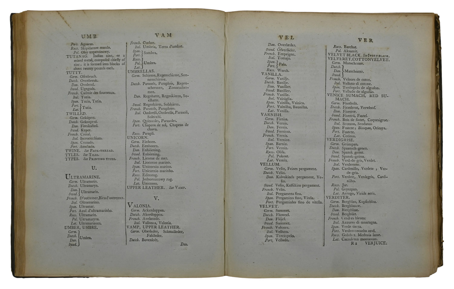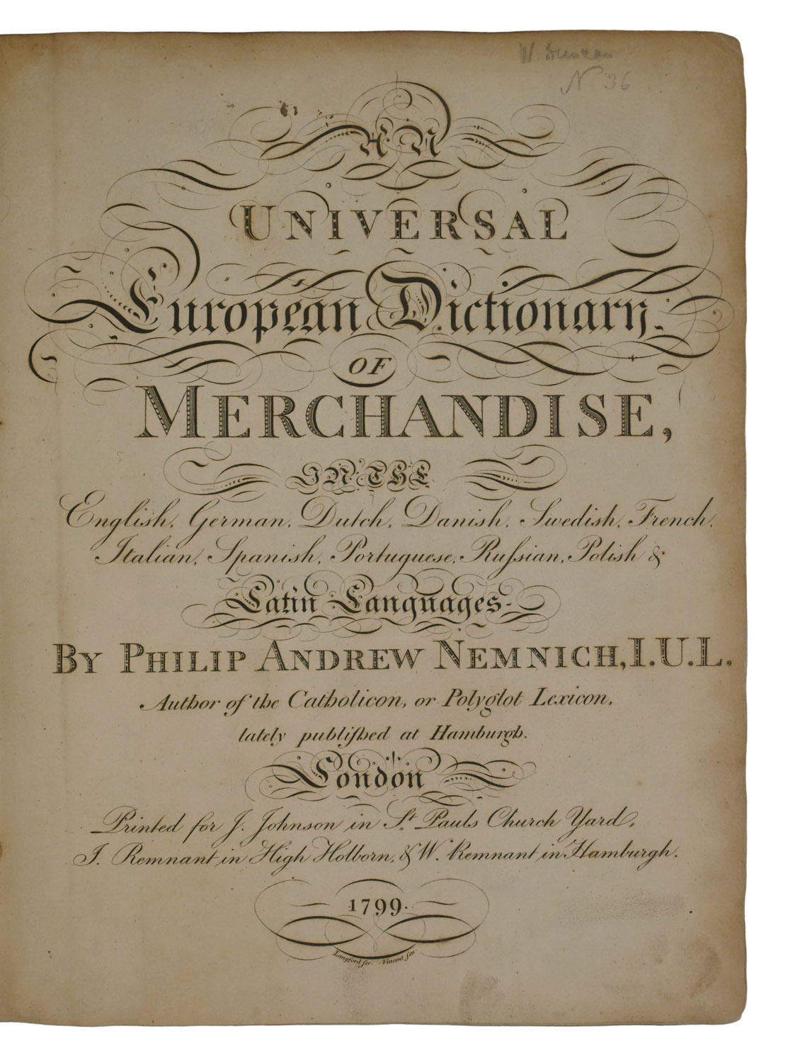 The first English edition of Nemnich's trade dictionary, in which an idiosyncratic collection of words related to trade, chattels and mercantile matters (Harness, Harpoons, Harpsichords, Hartshorn, Hats) are given in 11 languages, with some others (Hartall: 'the yellow arsenic', Head-Matter: 'The brains and blubber of the head of the South Sea spermaceti-whale') are glossed in English. Following this section are short word-lists in which each language is treated separately, with alphabetic lists translated to English. It was prepared concurrently with a German-language version by Hamburg-based lexicographer Philipp Andreas Nemnich (1764-1822).