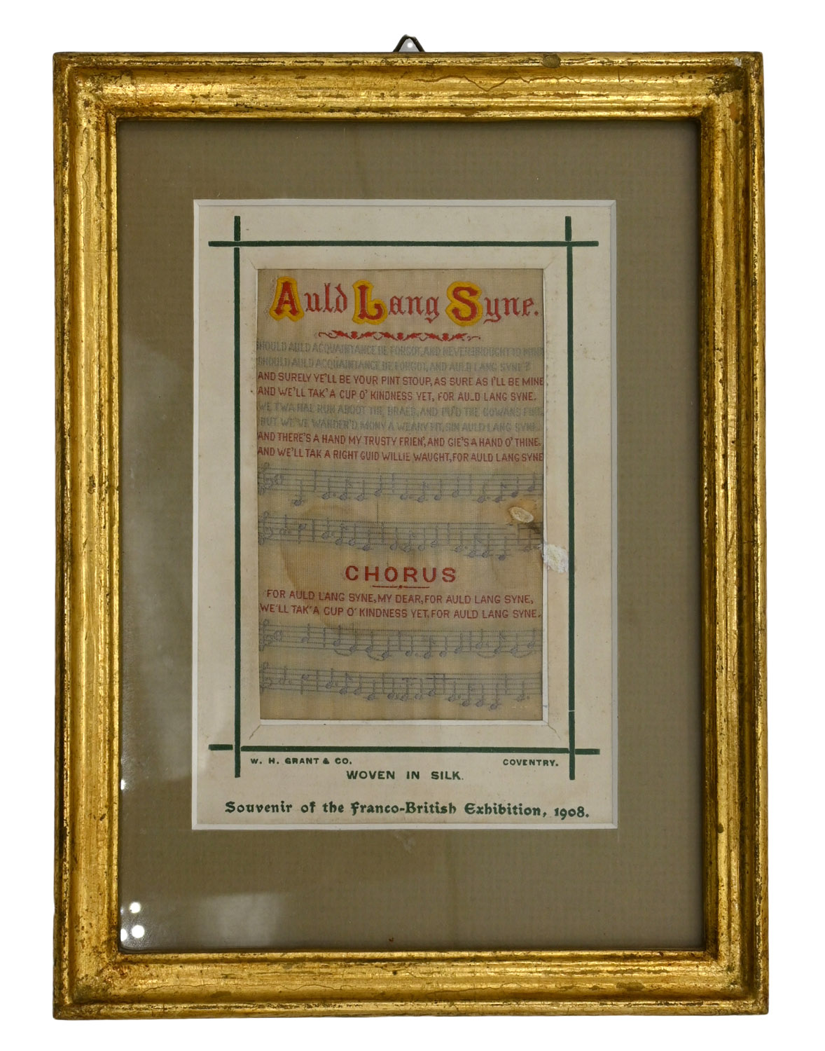 Woven silk broadside 60×90 mm, mounted in card 128x180mm, framed and glazed. Silk a little water-marked, small rent in blank area and mark to mounting card.