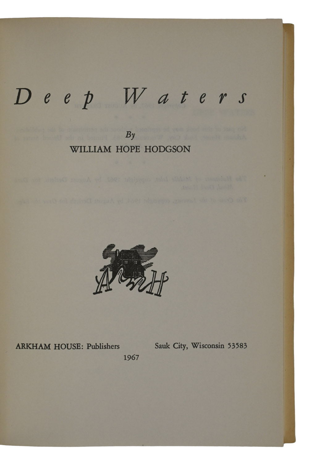 A gathering of 'macabre sea stories' by William Hope Hodgson (1877-1918), including three stories never before collected in book form. Two of these were found among Hodgson's manuscripts and sent by his sister Lissie to Arkham House for publication. The dustjacket art is by Frank Utpatel (1905-1980).