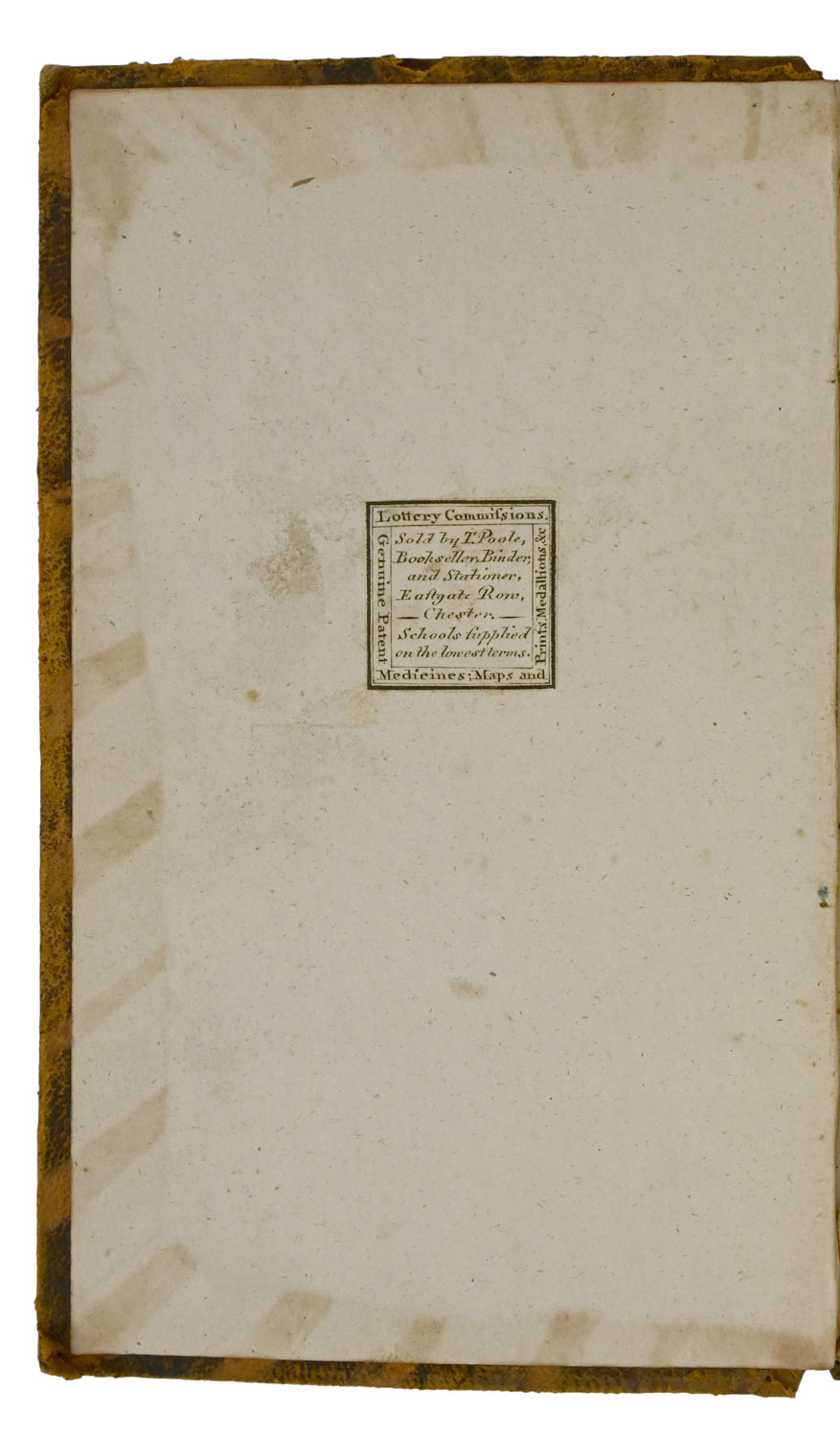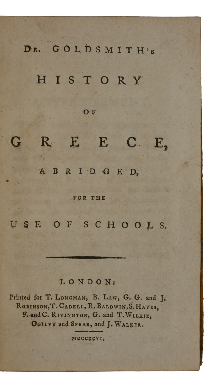 A rare edition of this abridgement of Goldsmith's history of Greece, unlocated by ESTC - but likely largely identical to the 1791 and 1798 editions recorded there, which feature many of the same booksellers in the imprint but in slightly different order. This copy features a bookseller's label from T. Poole of Eastgate Row in Chester, the border of which indicates his supply of 'Lottery Commissions, Genuine Patent Medicines; Maps and Prints, Medallions, &c.' and 'Schools supplied on the lowest terms'.