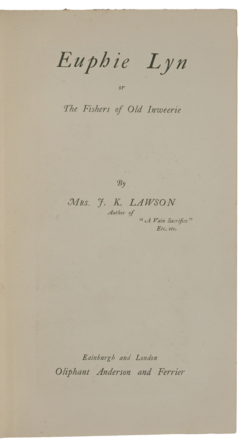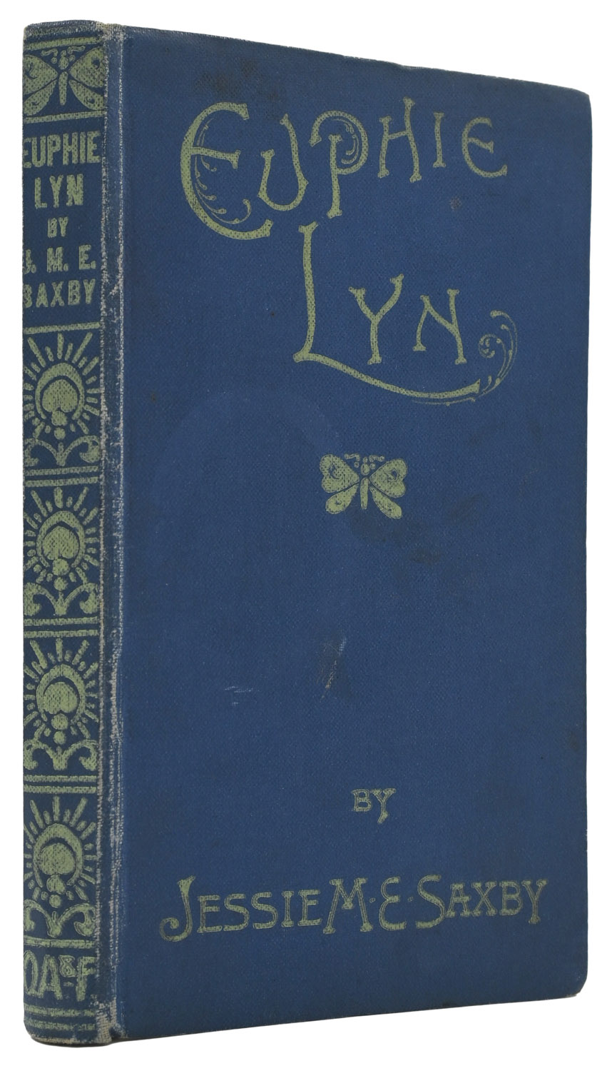 An oddity of publication - an early edition of a Fife-set novel by Scottish writer Jessie Kerr Lawson (1838-1917), who emigrated to Canada in the 1860s, in a publisher's binding crediting it instead to Shetlandic novelist Jessie M.E. Saxby (1842-1940). It was first published in 1893, this undated printing in the publisher's 'Butterfly Library' series is likely a slightly later reprint which has escaped the eye of posterity and the attention of cataloguers. Library Hub records 5 copies, all dated 1893, with Oxford designating theirs as number 6 in the 'Pocket Library', a series which at least seems to have credited the authors correctly on its bindings.