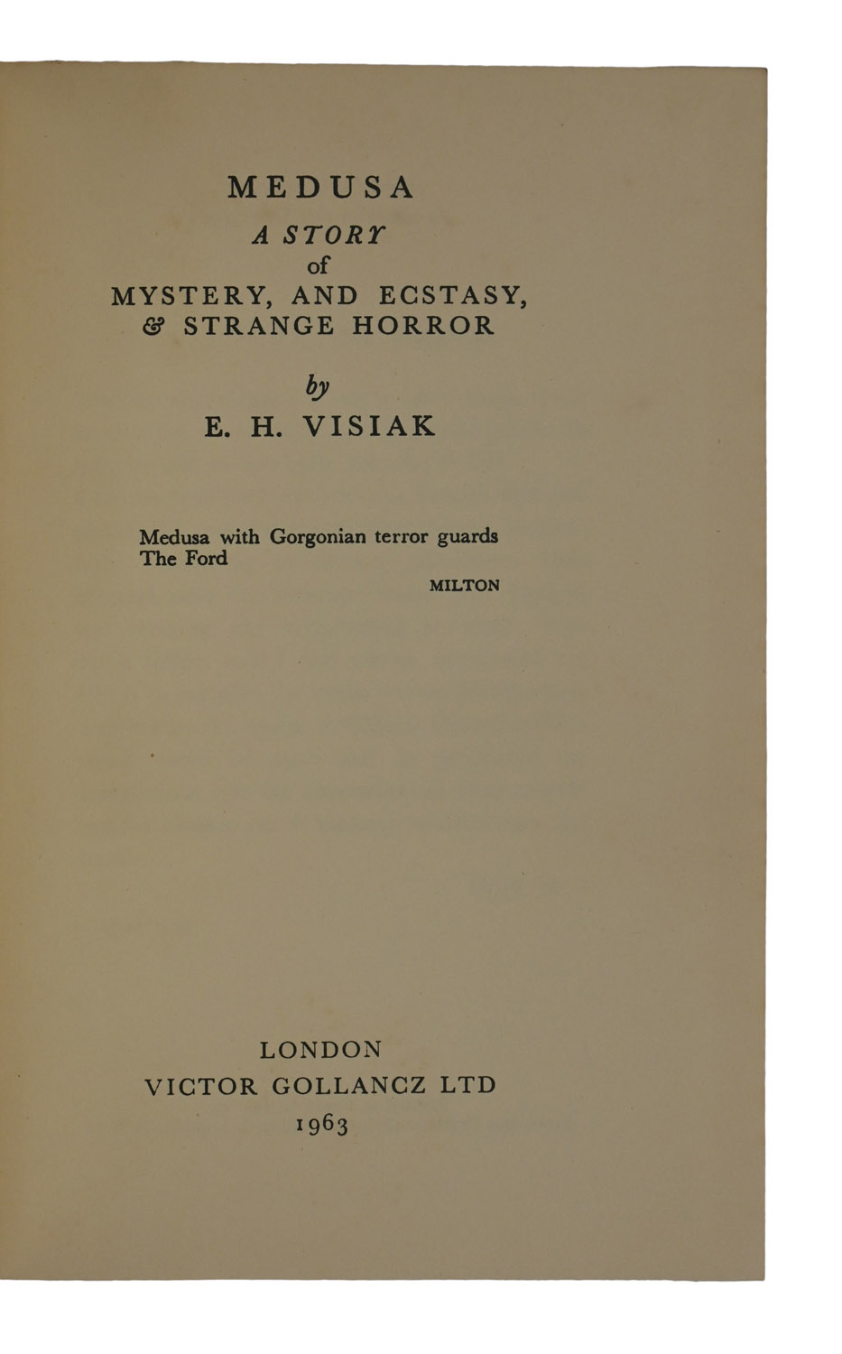 The 'Rare Works of Imaginative Fiction' Victor Gollancz re-issue of E.H. Visiak's (1878-1972) oft-neglected 1929 horror novel, hailed by Walter de la Mare as 'a most remarkable book-- product of a mind as resolutely individual and as strange as Blake's'. This was the second Gollancz edition, having first been republished as part of 'The Connoisseur's Library of Strange Fiction' in 1949.