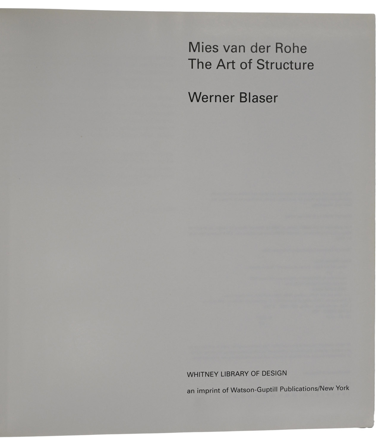 A later reprint of one of the many collaborations between architects Werner Blaser (1924-2019) and Mies van der Rohe (1886-1969), with van der Rohe granting Blaser permission to use his original German texts for the book in a 1964 letter. The work was first published in 1965, and Blaser notes that the only changes in this edition (and the 1993 German edition) are a slightly expanded appendix as well as new photographs of the 'outstanding buildings in their present setting'.