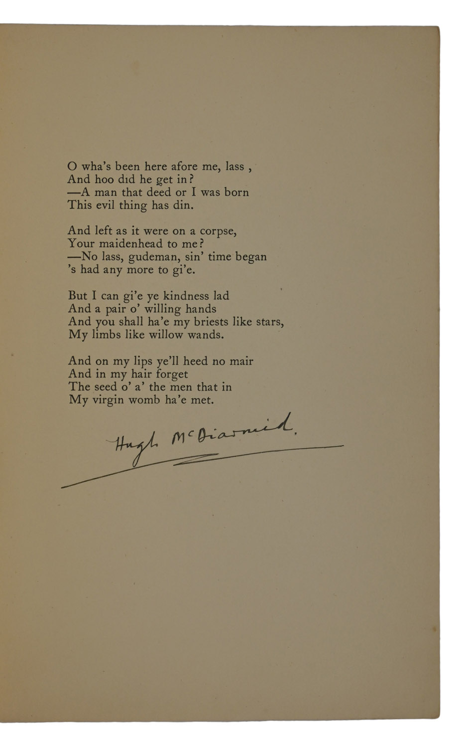 NO. 17 OF 100 COPIES SIGNED BY THE AUTHOR, single sheet of yellow card (290 x230mm) folded in half to make 4 pages. Just a touch of spotting, some light creases to corners. Signed by MacDiarmid to the third page.
