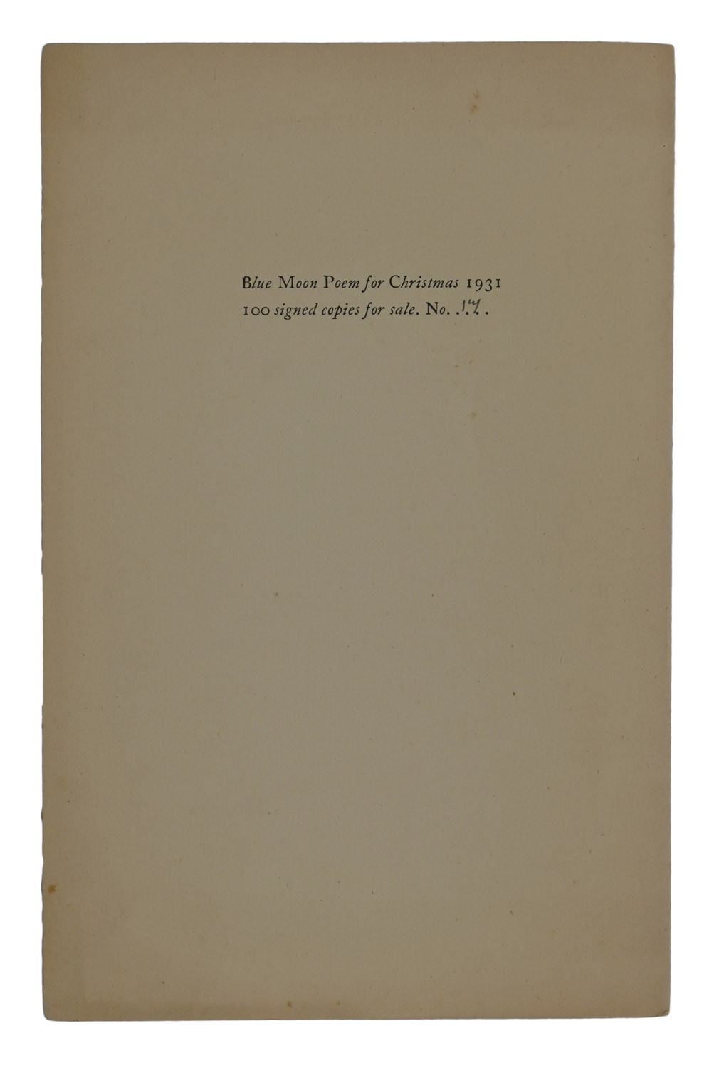 The 'Blue Moon Poem for Christmas 1931', per the final page, issued by radical bookseller and publisher Charles Lahr's short-lived Blue Moon Press, issued from The Progressive Bookshop in London. The text is four stanzas taken from MacDiarmid's 1926 poem 'A Drunk Man Looks at The Thistle', and the illustration to the first page is by Frederick Carter.