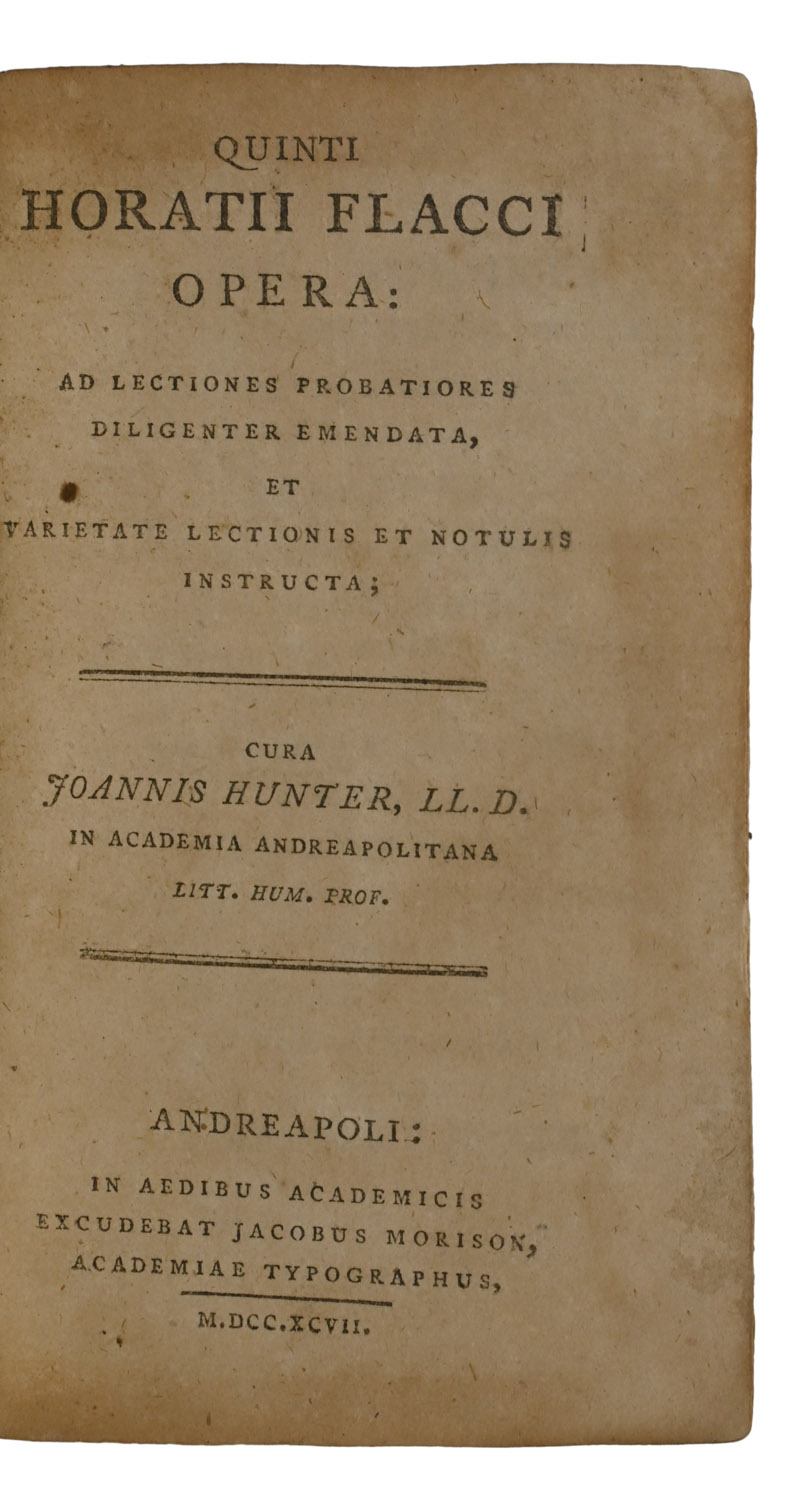 The scarce first printing of John Hunter's edition of Horace, which was reissued in two volumes in 1813. It was produced while he was Professor or Humanity at St Andrews, and printed by the Perth printer James Morison in his capacity as printer to the university. It is one of a series known as 'immaculate' classics, each of which was proofread three times by the printer and the editor. Hunter dedicated it to his erstwhile employer, Lord Monboddo. Dibdin calls it 'a neat and elegant pocket edition, and published with great care and correctness; at the end are some short and perspicuous notes'.