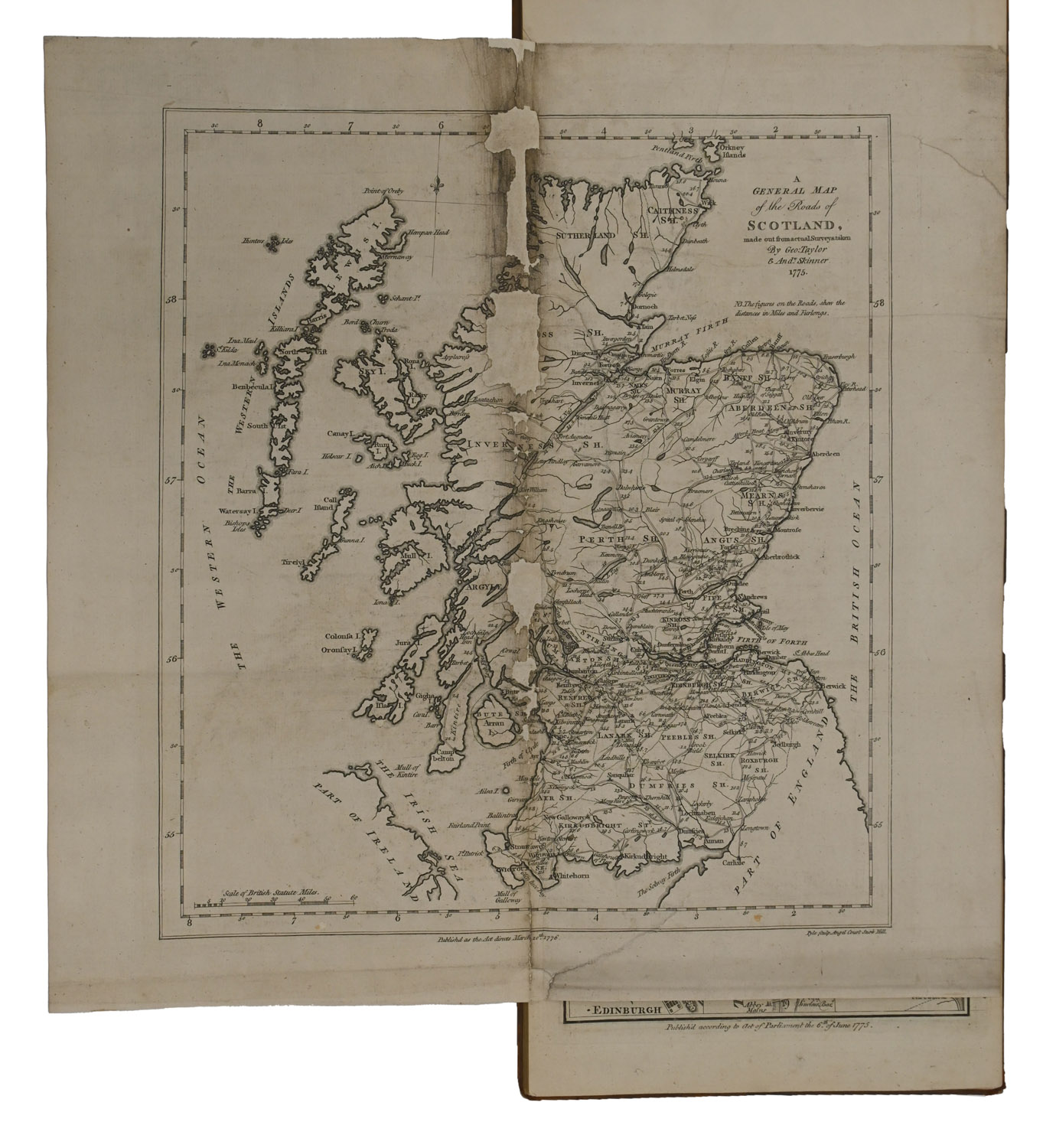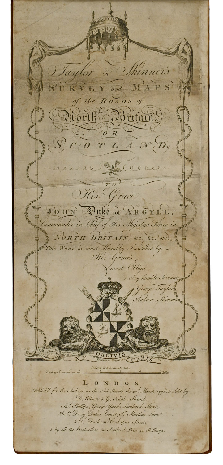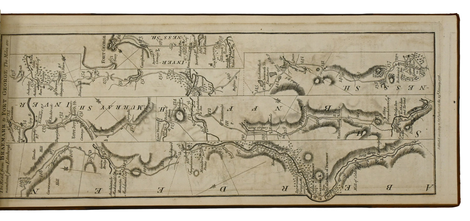 FIRST EDITION, obling slim folio, comprising engraved title-page, letterpress index leaf, double-page folding map, and 61 engraved strip maps on 31 sheets. Old half calf, spine lettered in gilt, marbled endpapers. Title-page foxed and soiled, showing old creases, folding map worn at fold and laid down with some areas of loss around fold, otherwise just some spotting and foxing. Binding marked and scratched, extremities rubbed and a bit worn.