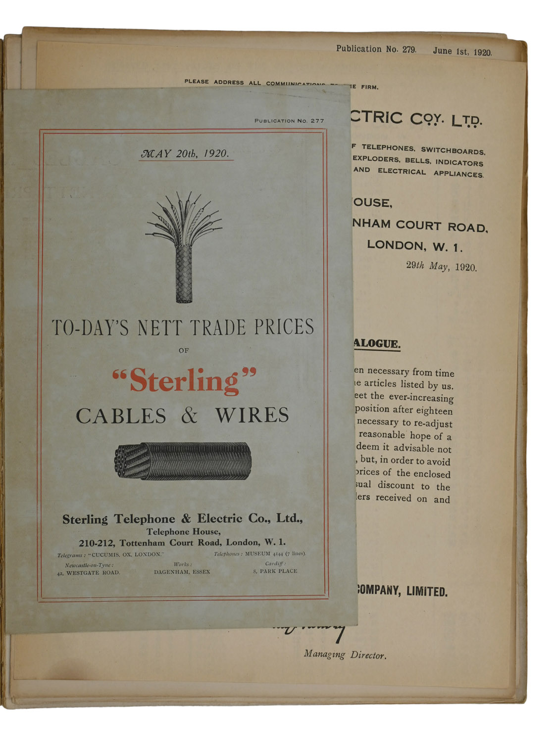 Large 8vo, pp. 155. Final leaf pasted to rear board, as issued. Original tan boards printed in brown backed in tan cloth, spine lettered in brown. Boards soiled and damp-marked, one corner bent and creased, a little worn to edges. Revised price-lists loosely inserted: 2 copies of one dated June 1st, 1920, 1 copy dated May 1st 1922 (both single folded sheets making 4 pages), one single-page printed letter advising of price-raises dated 29th May 1920, Cables and Wires trade prices leaflet dated May 20th 1920, a single folding sheet making 4 pages printed on blue paper.