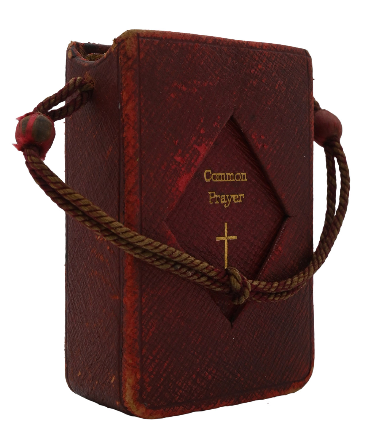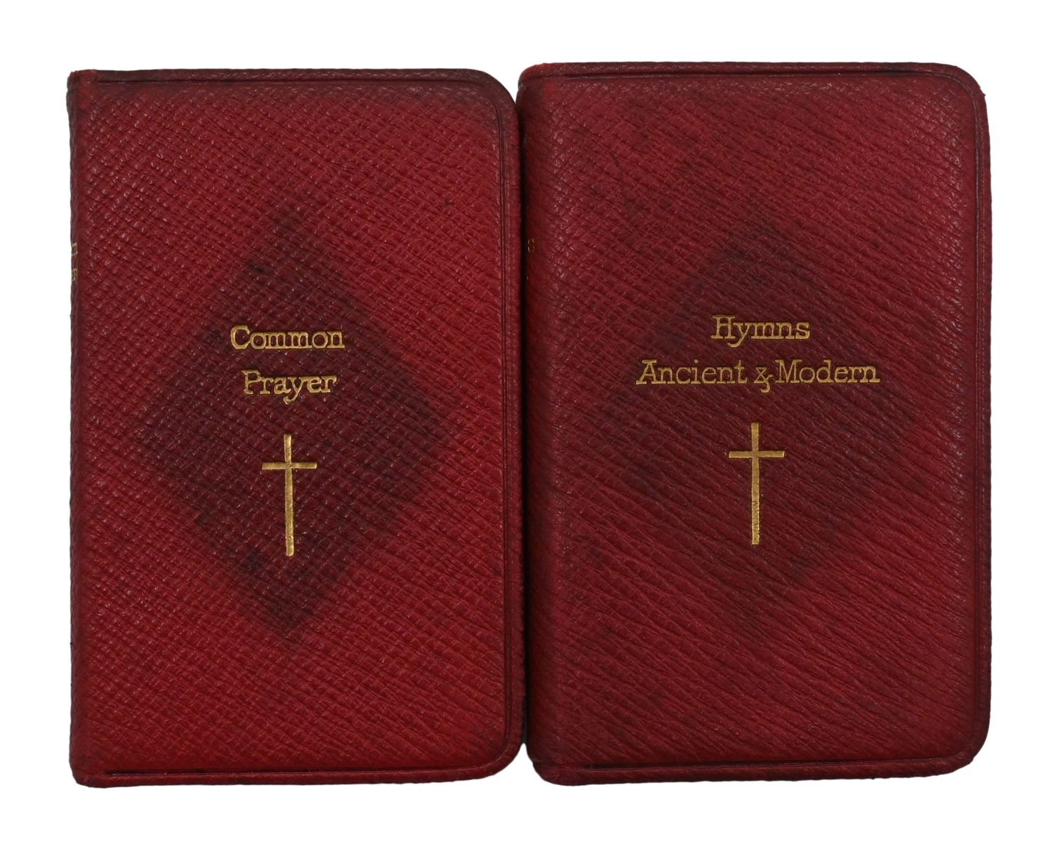 2 vols., 48mo, pp. 396; [iv], 468, [2]. Pages of common prayer bordered with single black rule. Full textured limp red leather, spines and front boards lettered in gilt, gilt cross to each front board, all edges gilt, matching leather carry case with diamond cutouts and small rope strap with two wooden beads. Small tear to gutter of hymns volume title-page. Slipcase rubbed and discoloured, diamond-shaped discolouration to boards of both volumes, carry rope colour worn away. Ink ownership inscription dated 1897 to verso of both front flyleaves, along with initials LGM in a similar hand.