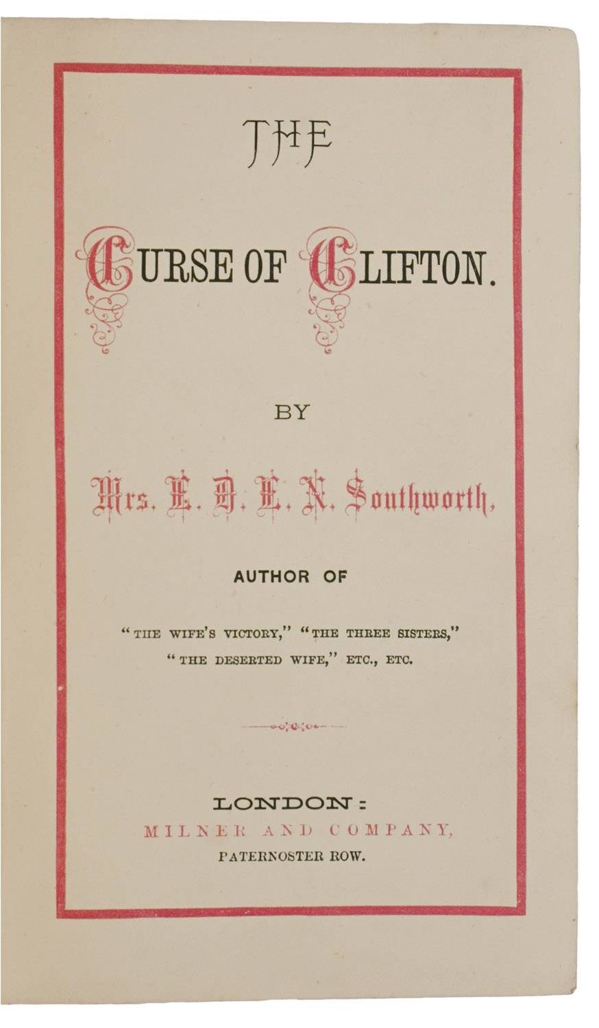 An undated reprint of American novelist Southworth's 1852 book, also published under the title 'The Tide of Fate'. This copy is in its original publisher's binding, which advertises it as being part of Milner's New Novelists' Library series.