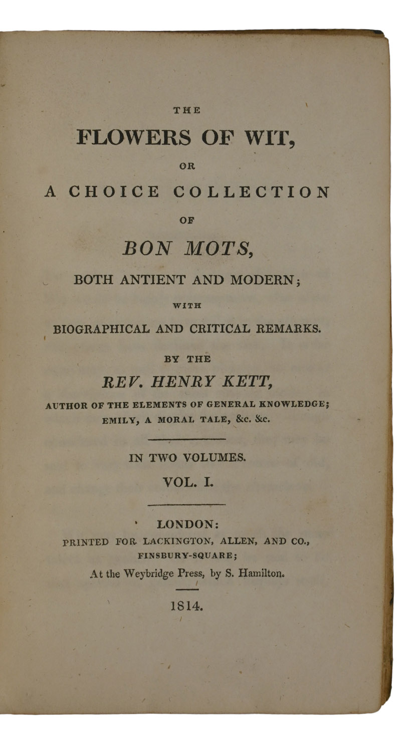 FIRST EDITION, 12mo, pp. [iii]-xxiv, 216; [ii], 222. Half-titles discarded. Contemporary green calf, boards bordered with triple blind rules, spines divided by double gilt rules, red morocco labels, 3rd compartments numbered direct in gilt. Some gatherings bound slightly proud, leather a little scratched and rubbed. Armorial bookplate of Sir Felix Booth to vol. 1 pastedown, his ownership inscriptions to flyleaves.