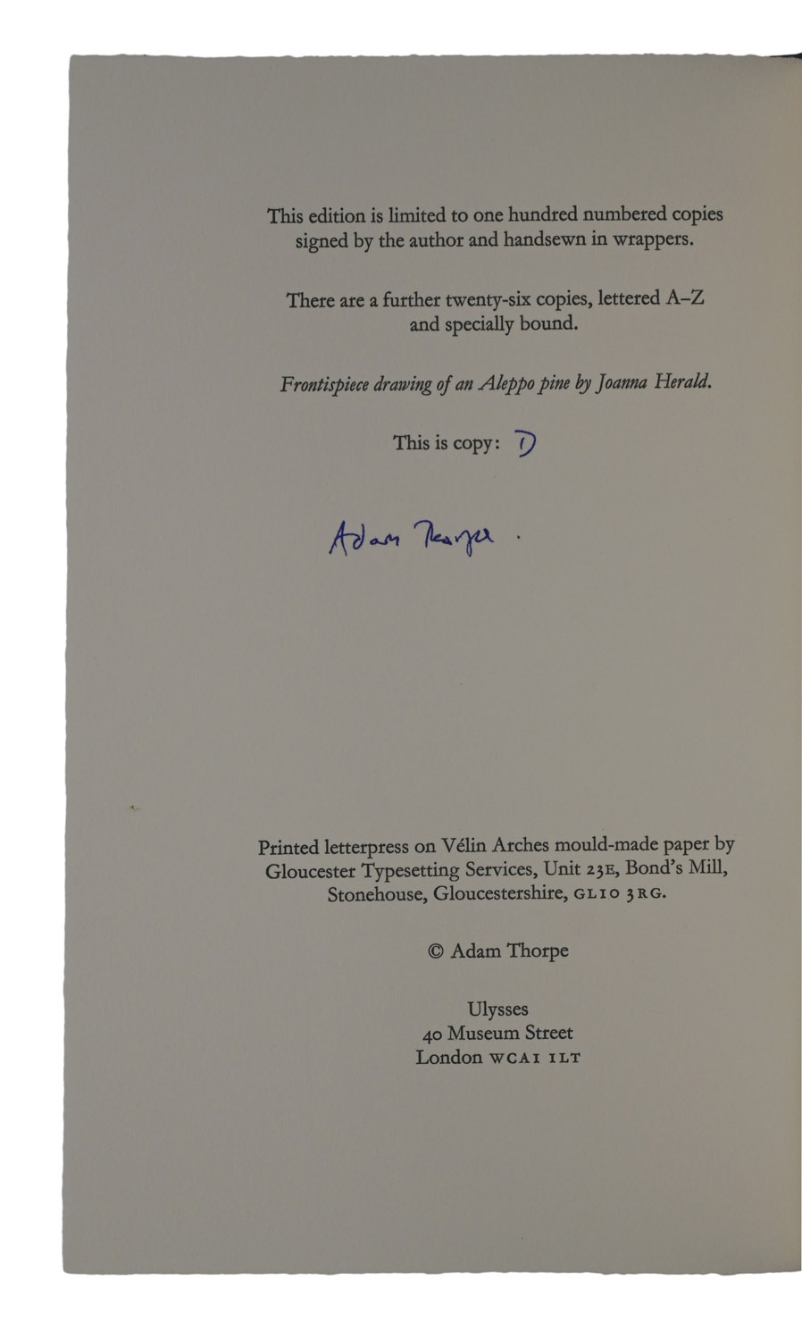 FIRST EDITION, ONE OF 26 COPIES SIGNED AND LETTERED BY THE AUTHOR, 8vo, pp. [16]. Printed on Vélin Arches mould-made paper. Original blue marbled boards backed in teal cloth, printed paper label to front board, clear plastic dustjacket. A fine copy. Signed and lettered ‘D’ by the author to the limitation-page, manuscript correction to penultimate leaf.