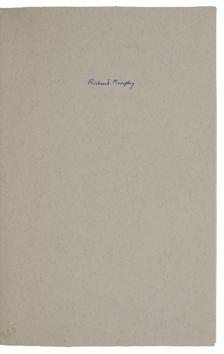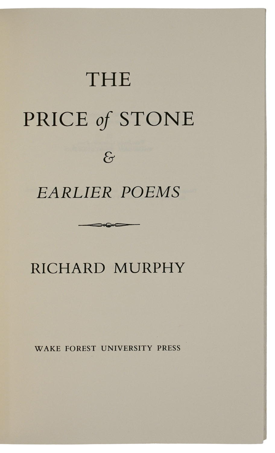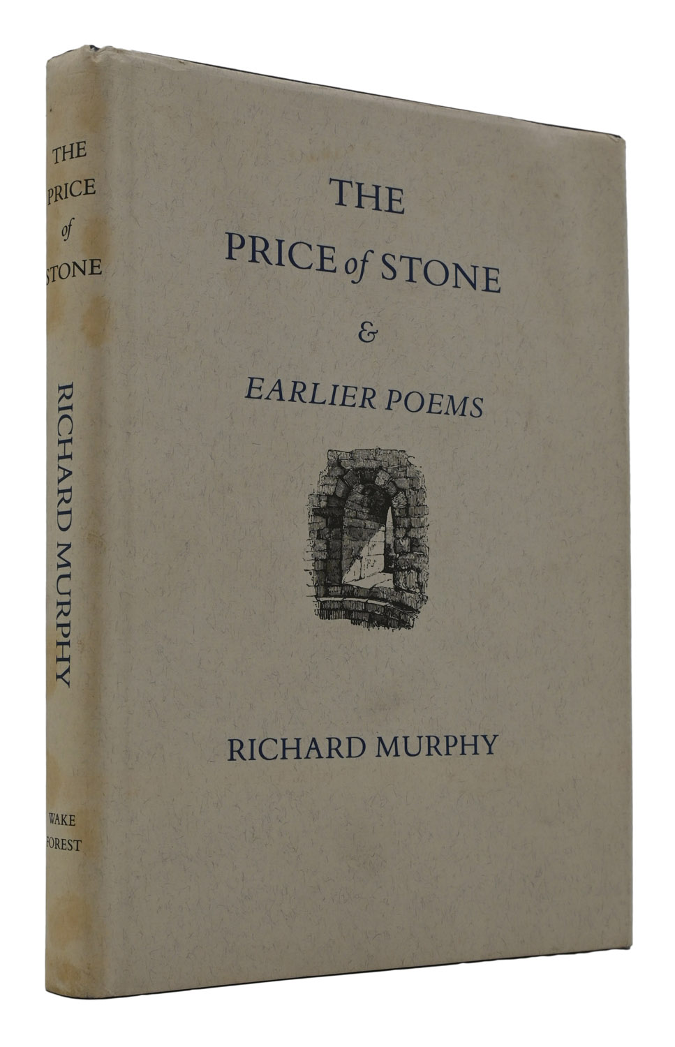 A signed copy of the boards issue of a book that functions as a collected poems by Irish poet Richard Murphy (1927-2018). It unites the first American printing of his sequence of 50 sonnets The Price of Stone, published the same year by Faber in London with material from his earlier collections Sailing to an Island, The Battle of Aughrim, High Island and Care.
