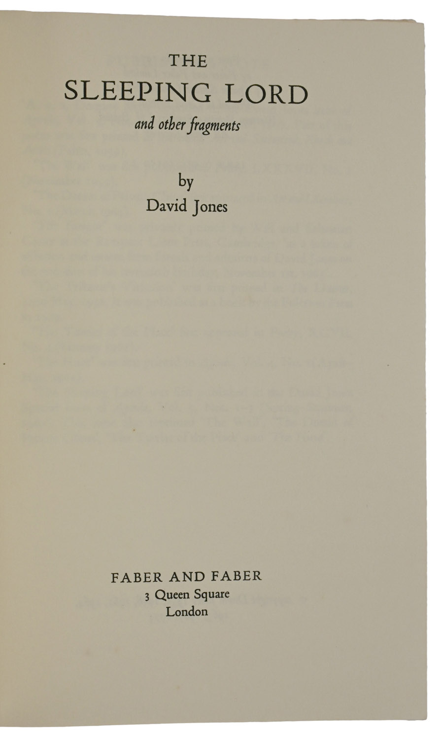 The first printing of this collection, which brings together various short pieces published in pamphlets and periodicals in the 21-year gap since his last large work 'The Anathemata'. It was also issued in a signed, limited edition of 150 copies in a special binding.